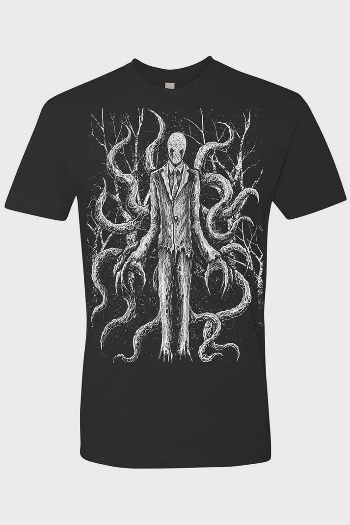 Invoke the supernatural with this haunting design, inspired by Slenderman! Faceless but with empty, malevolent eyes, the tall silhouette of the monster looms in a forest, with tentacles erupting from its ghostly white body. There, it waits to strike you with the paranoia of... Slenderman's Disease.